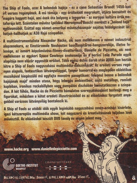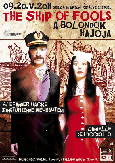 Sebastian Brant, német író, 1494-ban dolgozta fel ezt az allegóriát A bolondok hajója címmel. Ez a könyv ihlette Hieronymus Bosch azonos című festményét. Ebből a könyvből készített most, 500 évvel később, multimédiás dalszínházat az Einstürzende Neubauten oszlopos tagja, Alexander Hacke és alkotótársa/felesége, Danielle de Picciotto. Danielle sokoldalú képzőművész, filmes, énekesnő és nem mellékesen a berlini Love Parade egyik alapítója, így művészileg is remek párost alkot Hackéval, aki Blixa Bargeld szerint a Neubauten zenei igazgatója. Egyszóval nem akármi ez a két figura, mindkettő kultikus alakja a berlini undergroundnak.