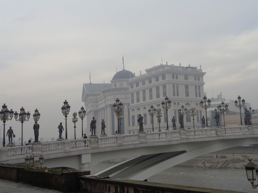 A Vardar folyón igen sűrűn átívelő hidak kiváló tájékozódási pontot jelentettek. A hidak számlálásával mindig tudtuk, éppen hol vagyunk, és például hány híd távolságra van a koncerthelyszín. A Kőhíd (Stone Bridge) Szkopje legfőbb jelképe. A XV. században épült, azóta persze többször is megrongálódott és újjáépült. Mellette nyújtózik a Civilizációk Hídja (Eye Bridge vagy The Bridge of Civilizations), amelyet 28 történelmi alak szobra ékesít. Utána következik a Művészetek Hídja (Art Bridge) a maga 29 szobrával. Aztán ott a gyönyörűen megmunkált, „bronzpajzsos” Szabadság-híd (Freedom Bridge), amelyet mindazon macedónok emlékére építették 1936-ban, akik életüket adták a szabadságért, és a Skopje 2014 projekt keretén belül csak felújították. A Kőhíd másik oldalán amúgy most is folyik egy építkezés, készül az újabb híd…