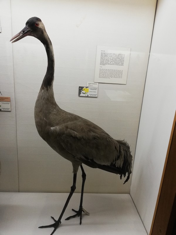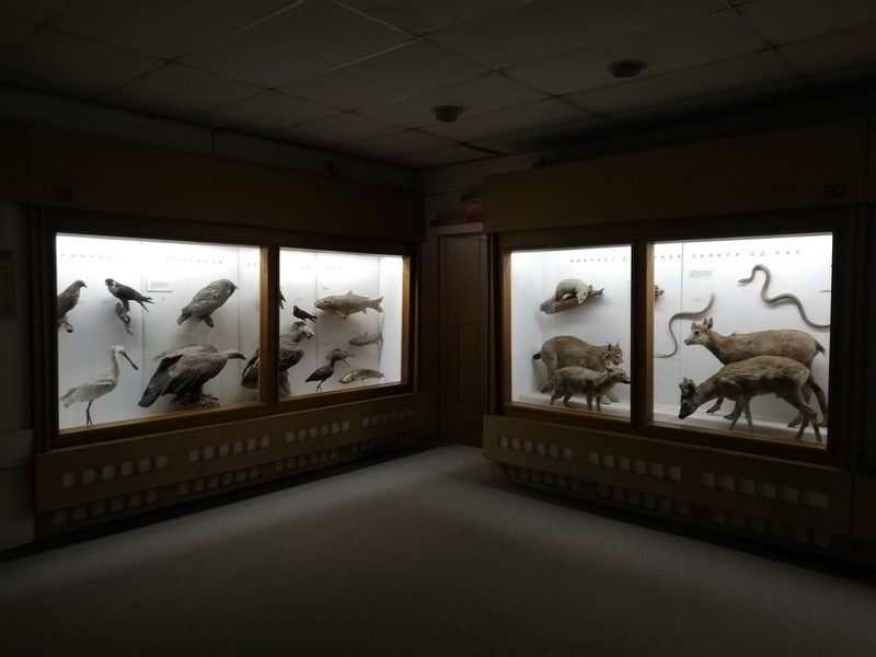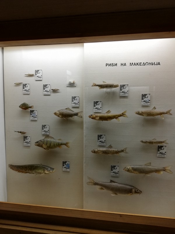 Elsősorban preparált állatok találhatóak, vitrinekben vagy nagyon szépen megcsinált diorámákban kiállítva. Az emeleten a gerincesek: halak, kétéltűek, hüllők, madarak és emlősök. Különösen a madárgyűjtemény lenyűgöző, rengeteg fajt mutatnak be. Szerintem méltó párja a bécsi Természettudományi Múzeum hasonló tárlatának. A legtöbb madaras vitrinben van angol nyelvű kiírás is az adott jószág életmódjáról, de aztán a többi helyen ez elmarad, utána csak nézelődtem, olvasni nem tudtam. De ebben a múzeumban ez nem olyan nagy baj. Latinul mindegyik tárolóban ki van írva az állatok neve, és kis Európa-térképen jelölik az élőhelyüket. Természetesen a gyűjtemény Macedónia élővilágának bemutatására helyezi a legnagyobb hangsúlyt.